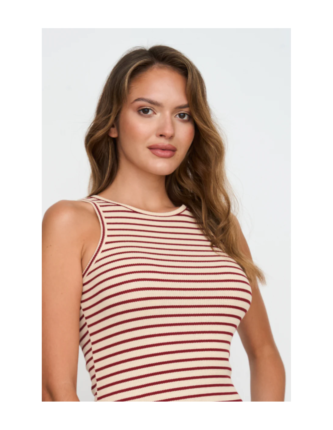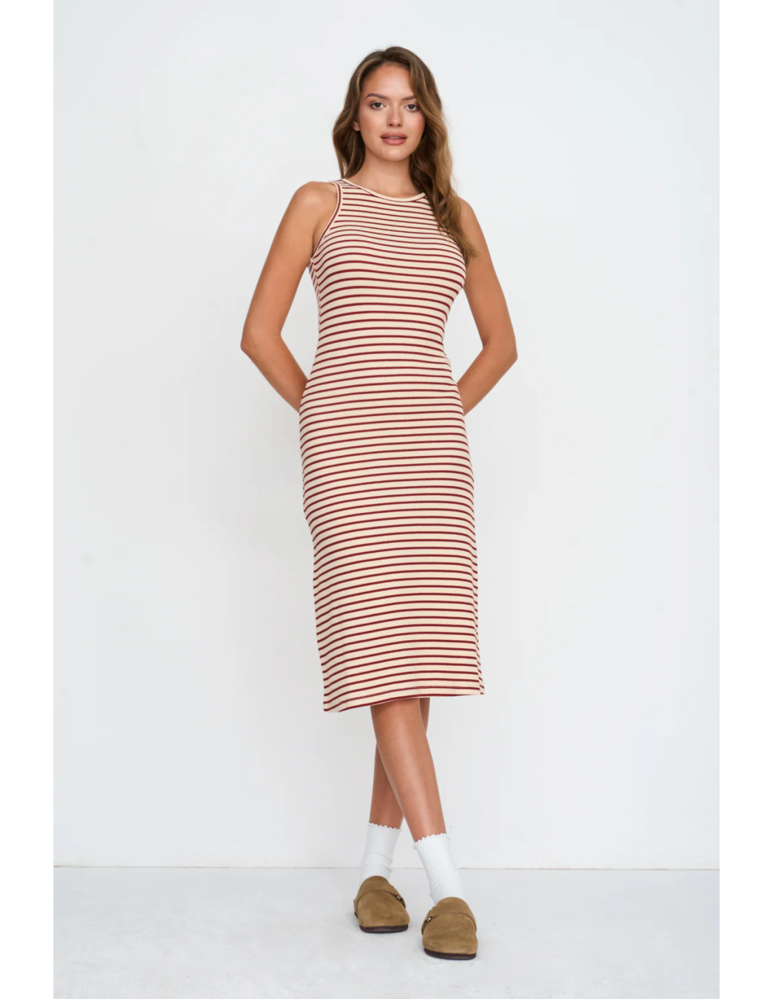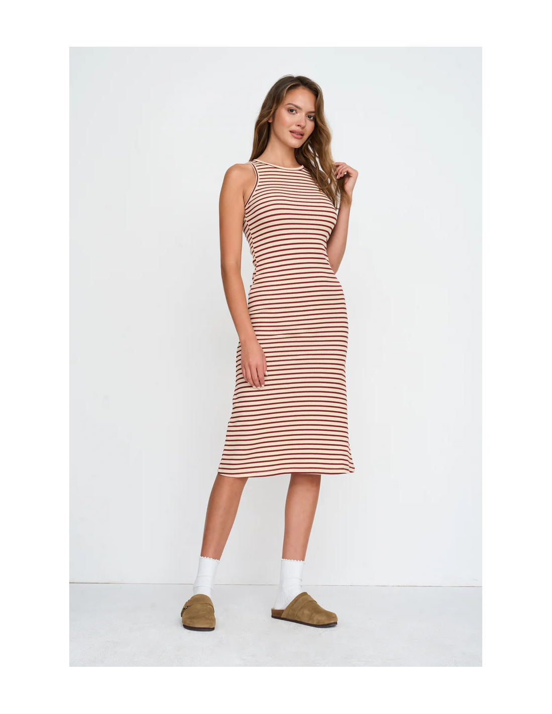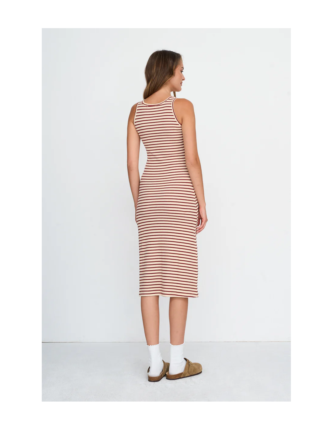 Φόρεμα με κολλητό λουράκι με κόκκινες ρίγες. Υλικό: 100% βαμβάκι. Μέγεθος πλάτης 38: 110 cm.