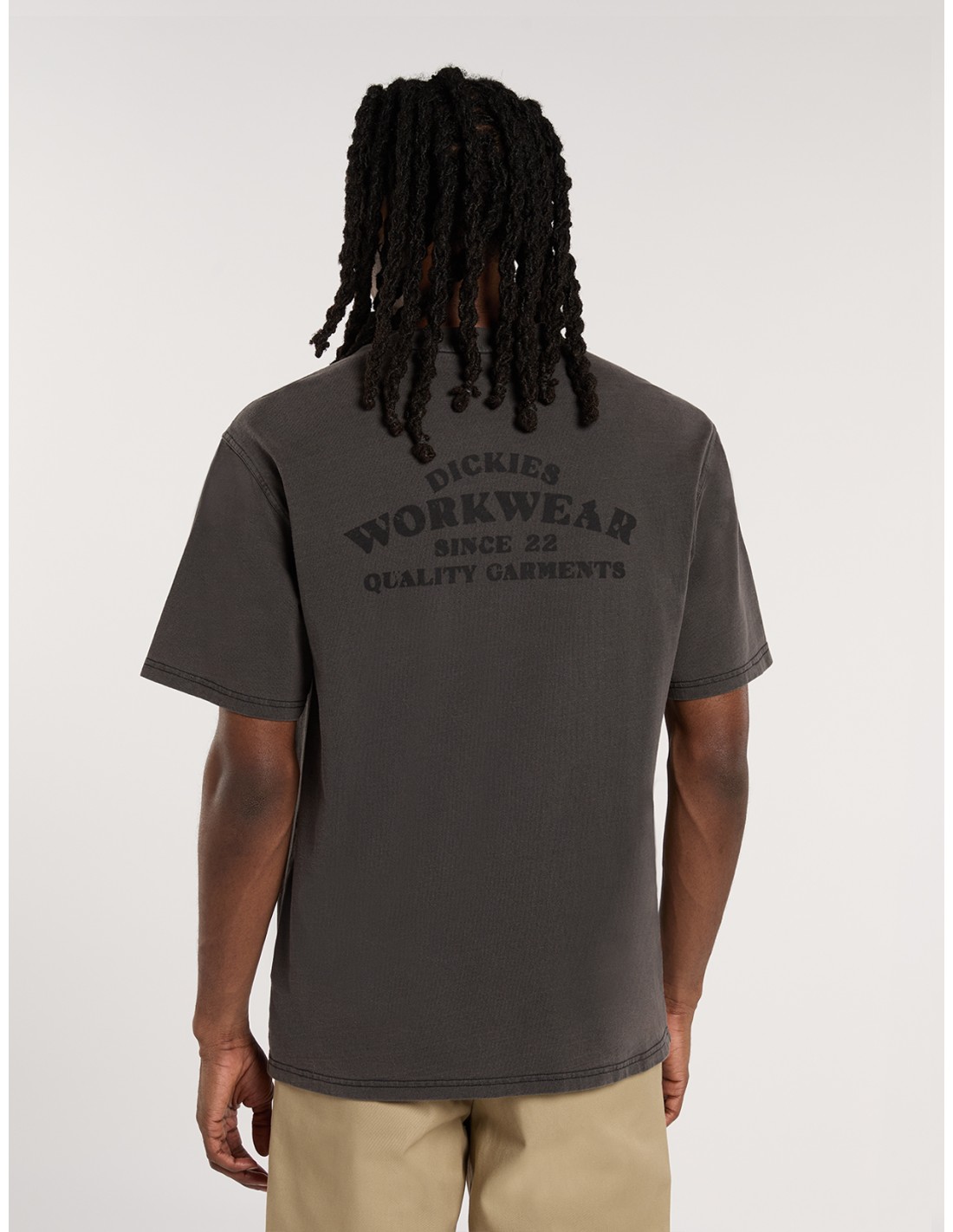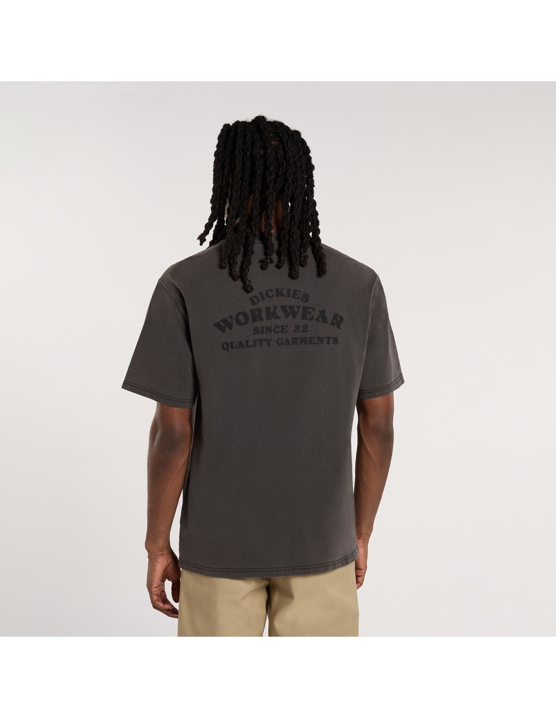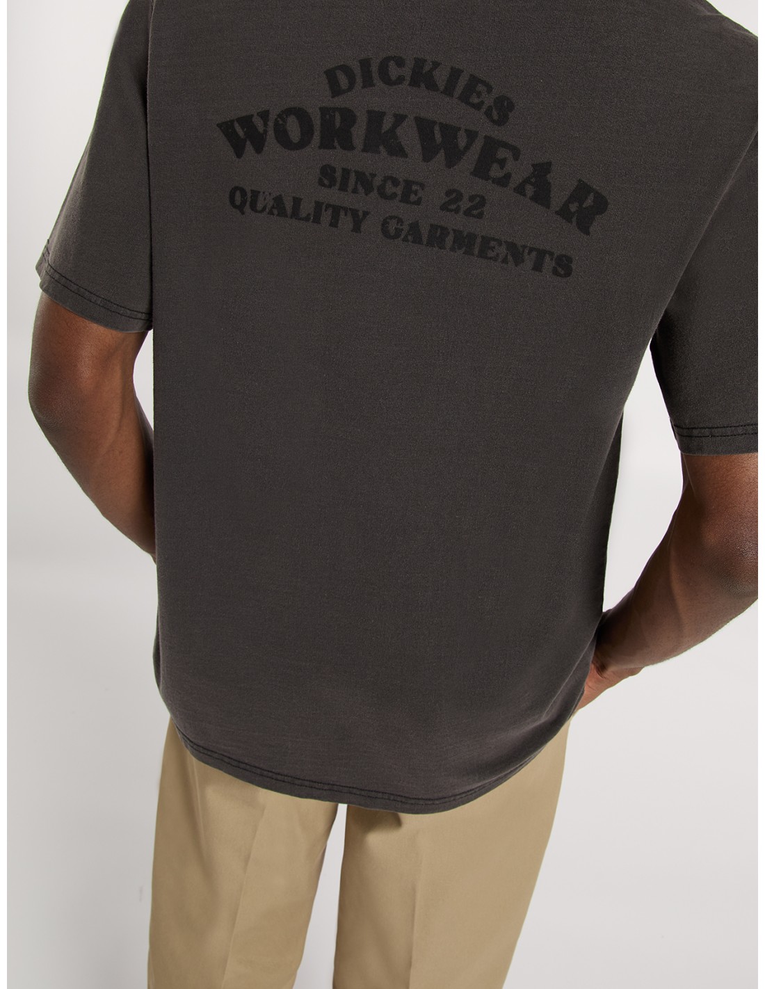 DickiesCreating quality garments for well over a century, the back print on this Dickies t-shirt reflects that, Cut from a cotton jersey before being garment dyed for a soft feel and deep colour, workwear and streetwear go hand in hand here.