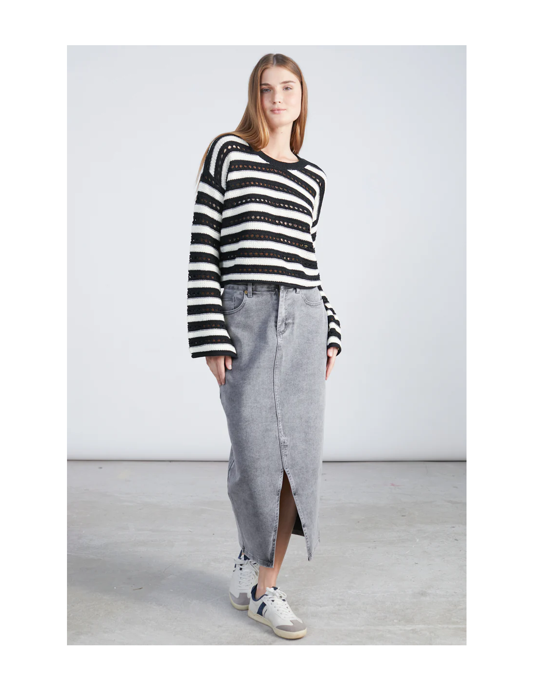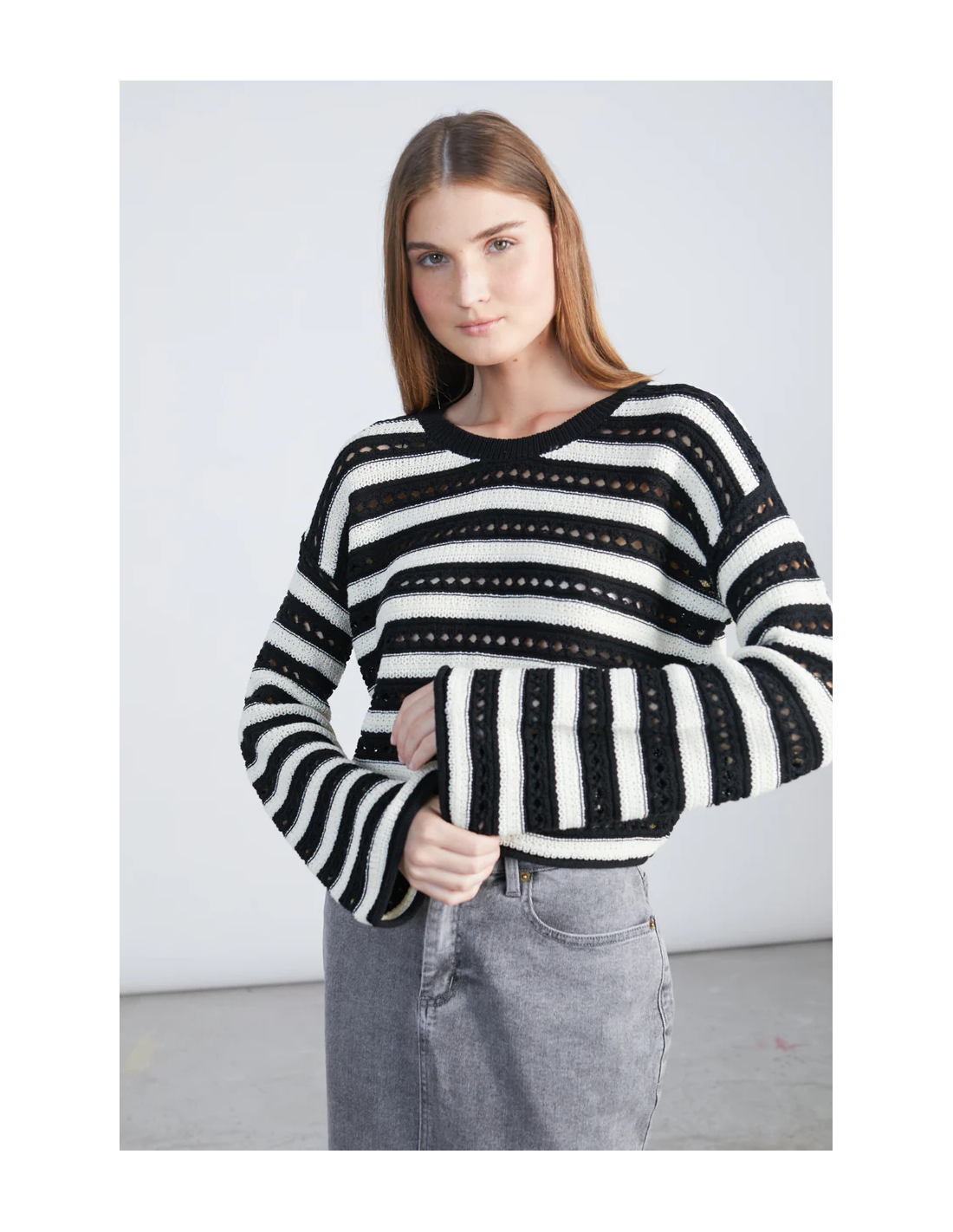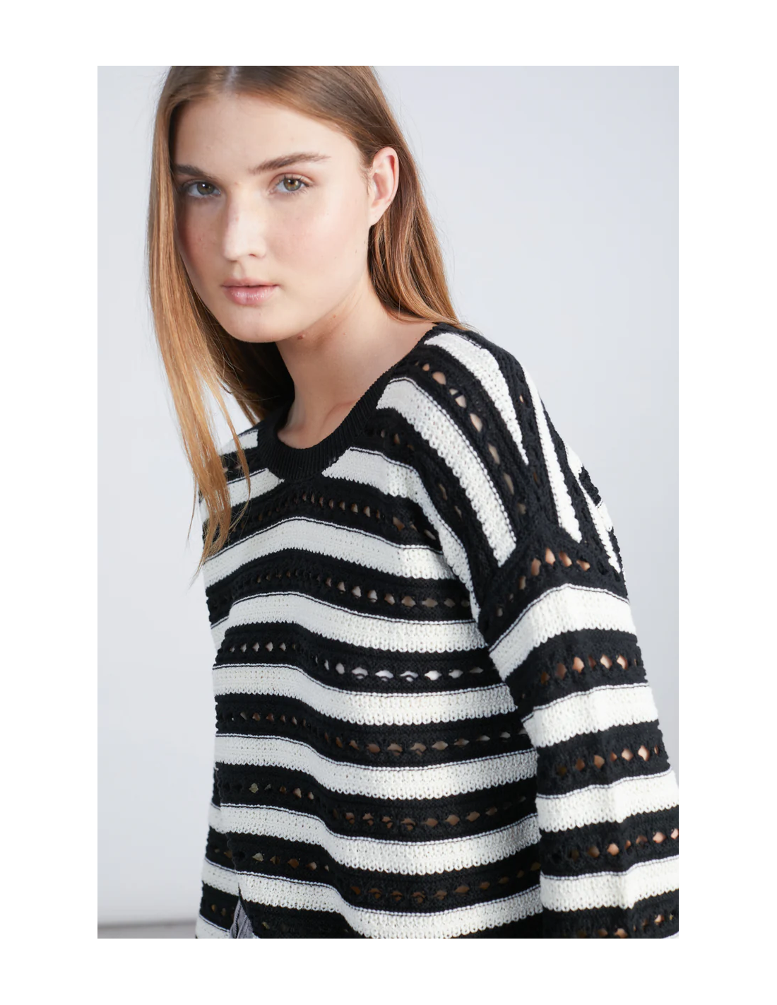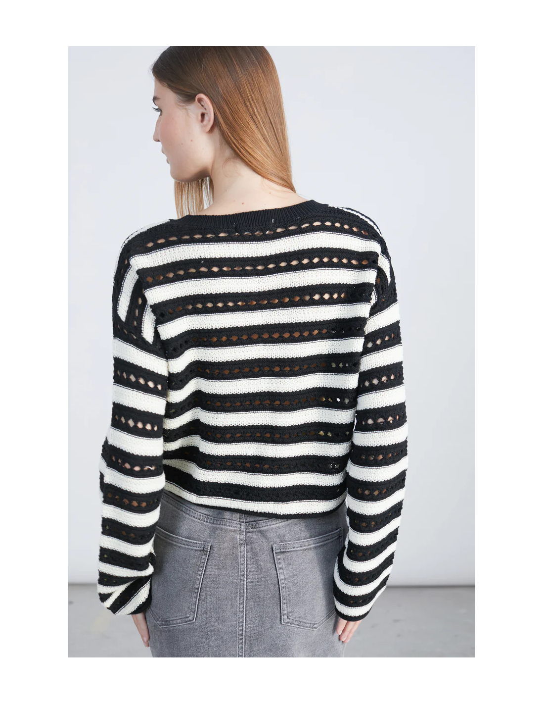 Πλεκτό πουλόβερ σε ασπρόμαυρες ρίγες με σχέδιο τρύπας