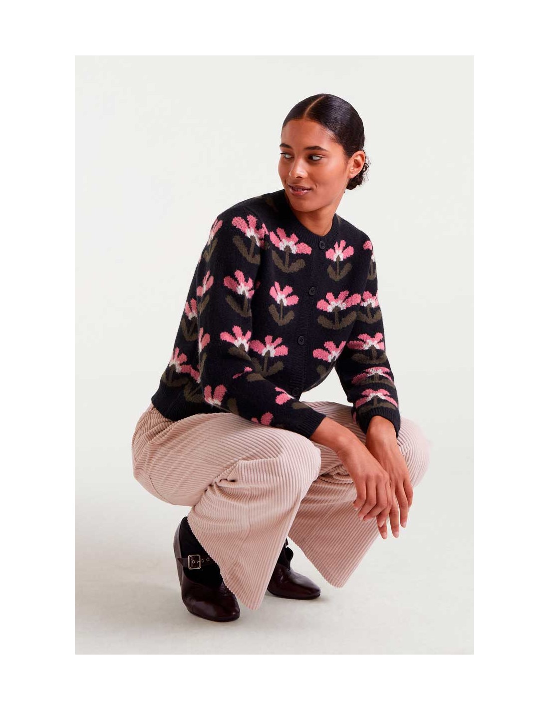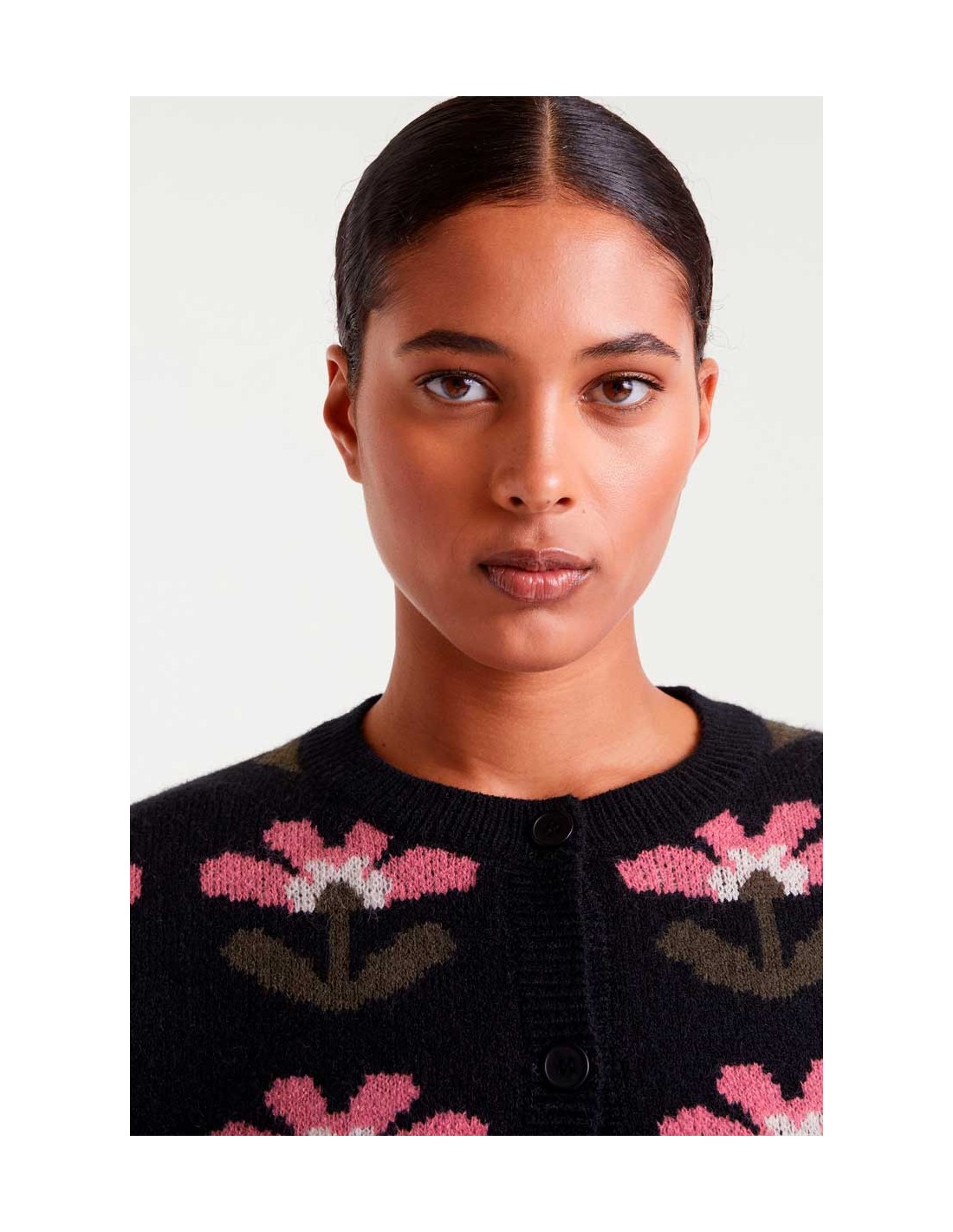 Ζακάρ ζακέτα με στάμπα Baboushka Big. Στρογγυλή λαιμόκοψη και μακριά μανίκια. Κλείσιμο με κουμπιά μπροστά. Ριμπ λεπτομέρειες. Το μοντέλο έχει ύψος 175 εκ. και φοράει μέγεθος S.