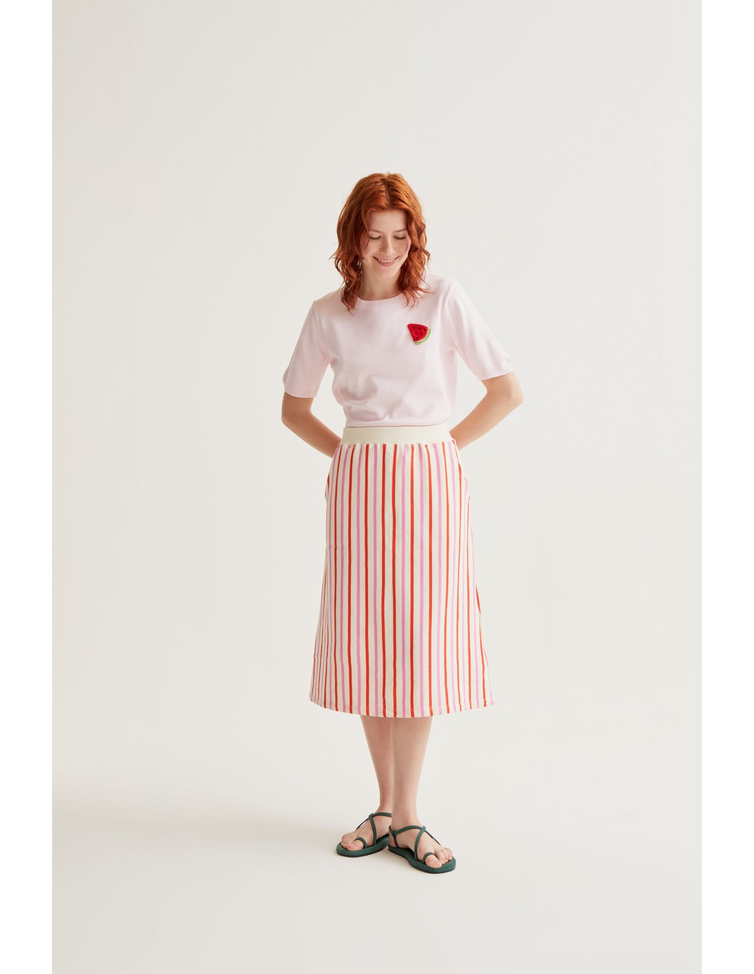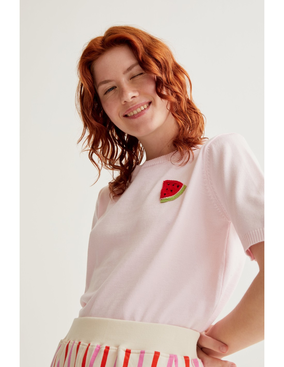 Ροζ πλεκτό τοπ. Στρογγυλή λαιμόκοψη και κοντά μανίκια. Κεντημένη λεπτομέρεια καρπουζιού σε αντίθεση. Ριμπ τελείωμα. Το μοντέλο έχει ύψος 175 εκ. και φοράει μέγεθος S.