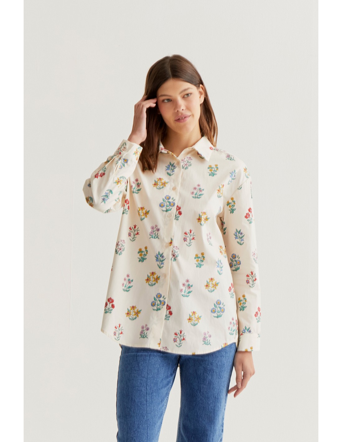 Πουκάμισο από 100% βαμβάκι με στάμπα κηπουρού. Γιακάς με πέτο και μακριά μανίκια με κουμπωτές μανσέτες. Κλείσιμο μπροστά με λευκά κουμπιά. Ελαφρώς χαμηλωμένοι ώμοι. Το μοντέλο έχει ύψος 177 εκ. και φοράει μέγεθος S.
