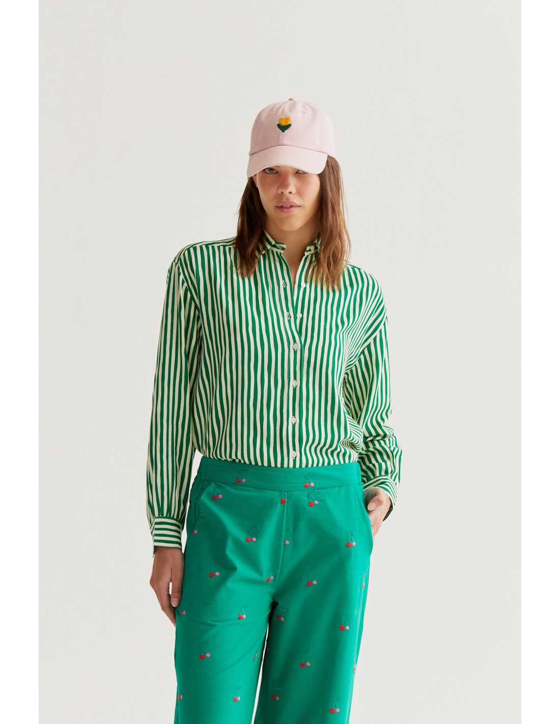 Πουκάμισο με τύπωμα σε χρώμα lavagna. Γιακάς με πέτο και μακριά μανίκια με κουμπωτές μανσέτες. Ελαφρώς χαμηλωμένοι ώμοι. Κλείσιμο μπροστά με κουμπιά και λευκά κουμπιά. Το μοντέλο έχει ύψος 177 εκ. και φοράει μέγεθος S.