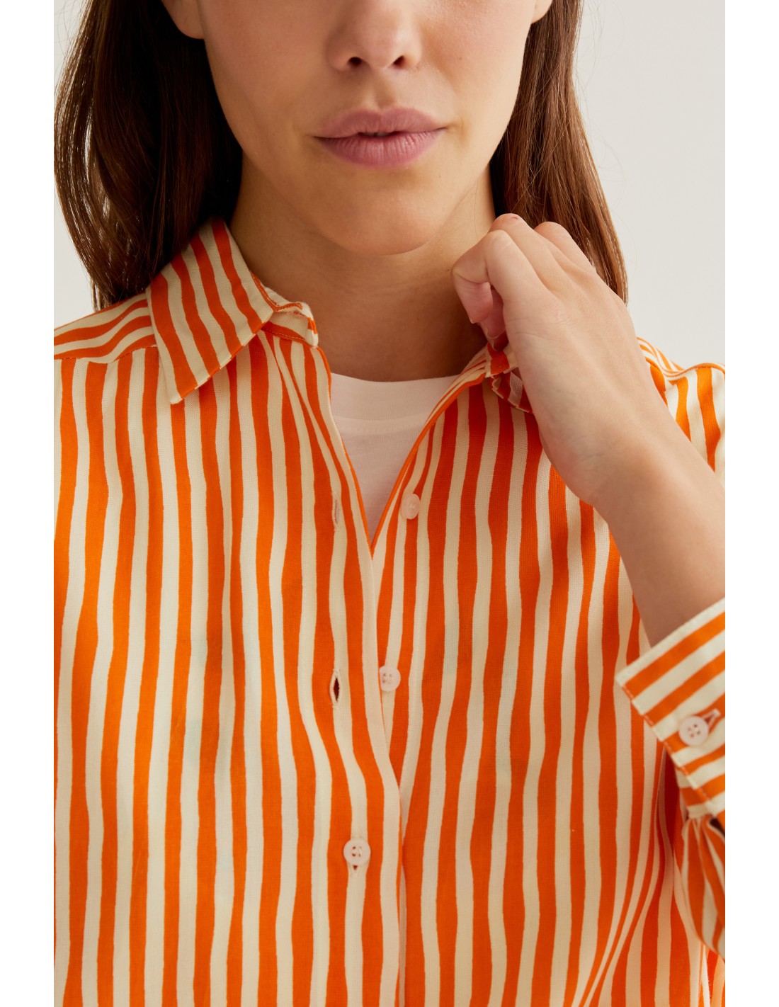 Πουκάμισο με τύπωμα σε χρώμα lavagna. Γιακάς με πέτο και μακριά μανίκια με κουμπωτές μανσέτες. Ελαφρώς χαμηλωμένοι ώμοι. Κλείσιμο μπροστά με κουμπιά και λευκά κουμπιά. Το μοντέλο έχει ύψος 177 εκ. και φοράει μέγεθος S.