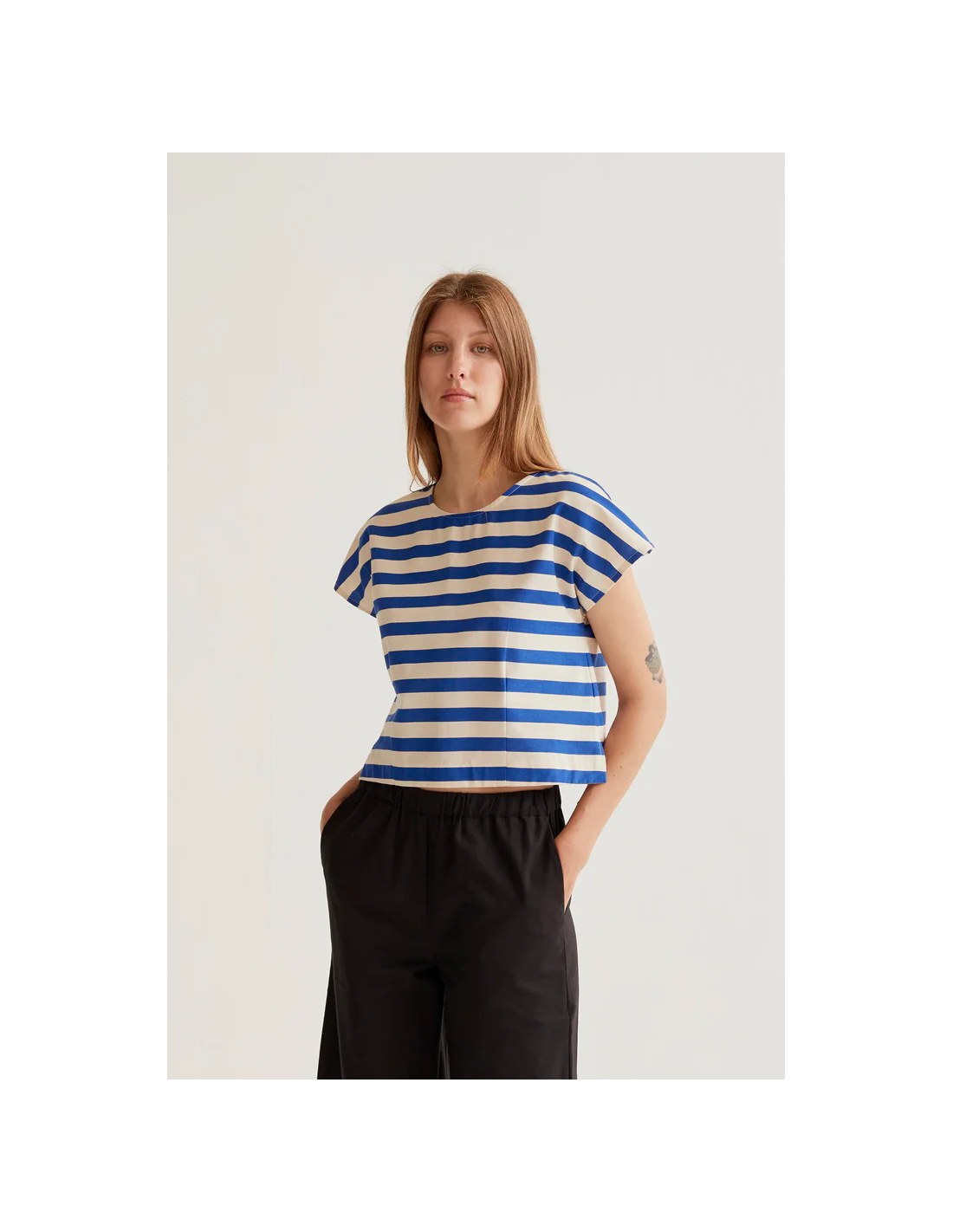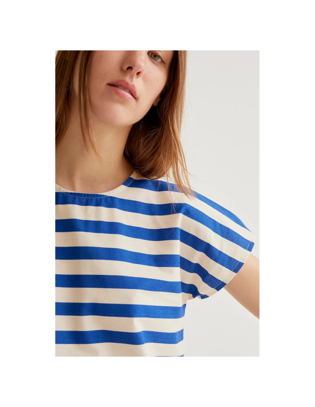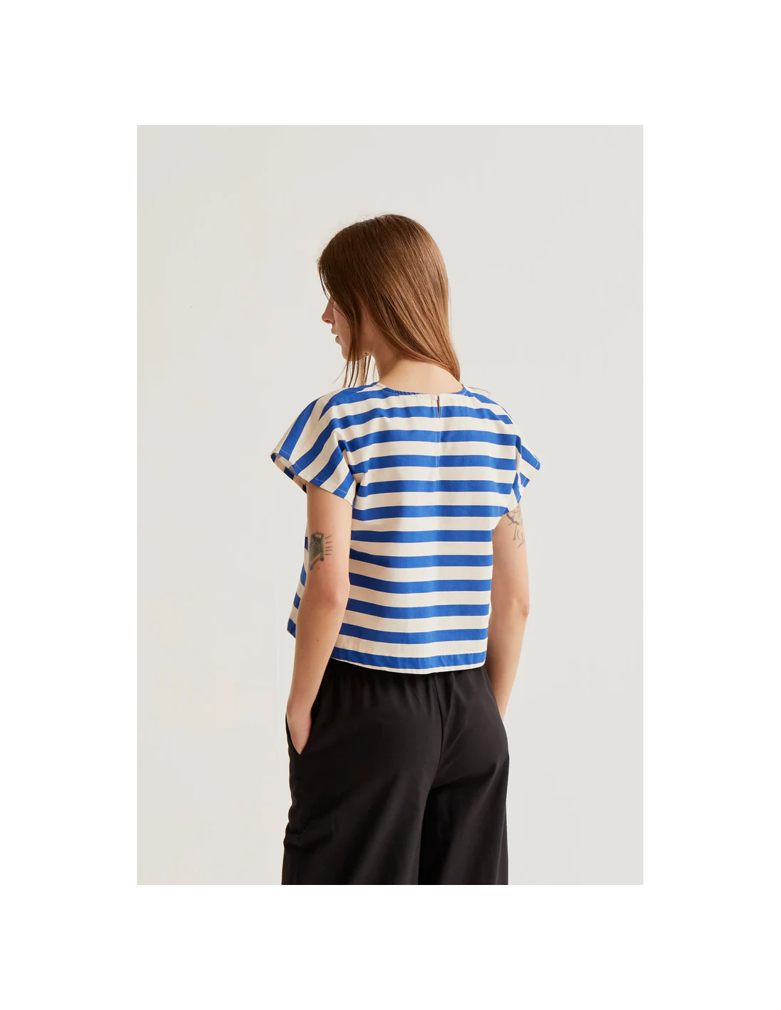 Μπλούζα από 100% βαμβάκι με μπλε τύπωμα από μπαμπού. Στρογγυλή λαιμόκοψη και κοντά μανίκια. Κρυφό κλείσιμο με κουμπιά στο πίσω μέρος της λαιμόκοψης V. Το μοντέλο έχει ύψος 177 εκ. και φοράει μέγεθος S.