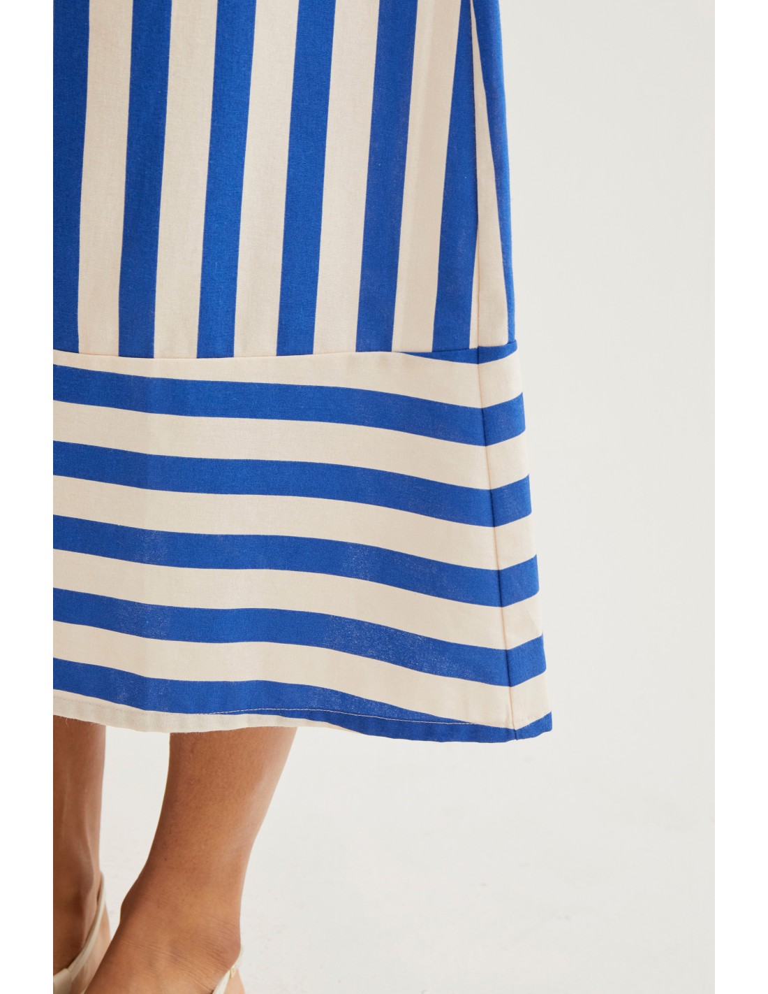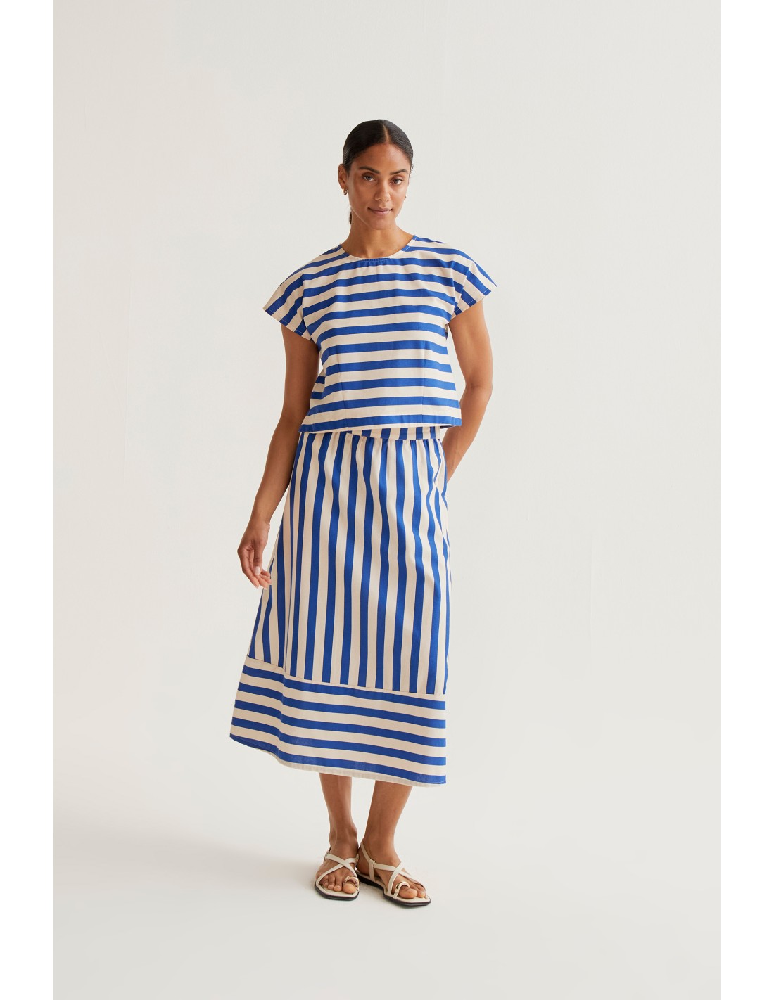 Μίντι φούστα από 100% βαμβάκι με μπλε τύπωμα από μπαμπού. Ψηλόμεση ελαστική ζώνη με σταθερή εφαρμογή. Λεπτομέρεια οριζόντιας ρίγας σε αντίθεση στο στρίφωμα. Το μοντέλο έχει ύψος 173 εκ. και φοράει μέγεθος S.