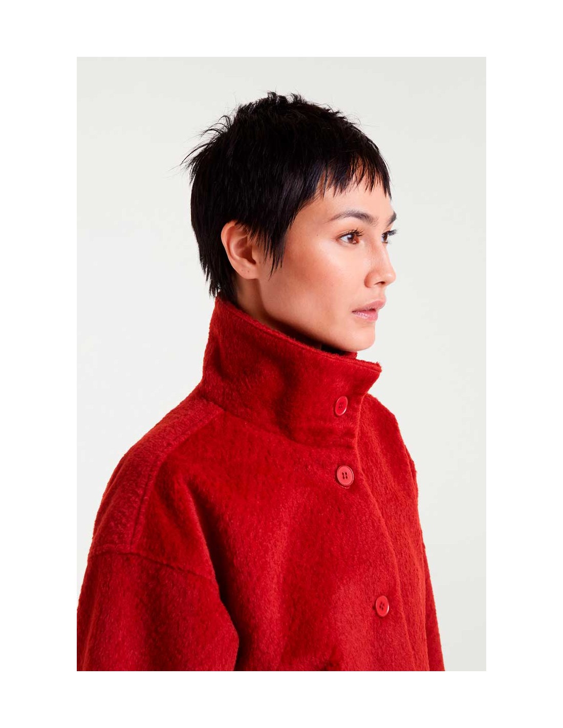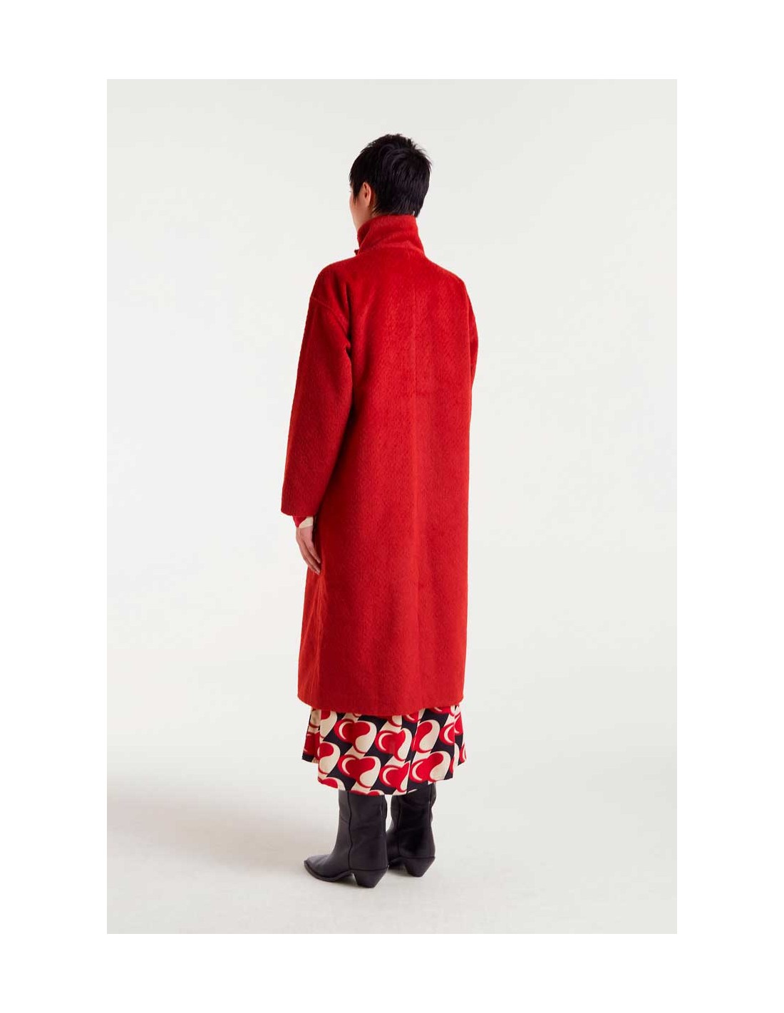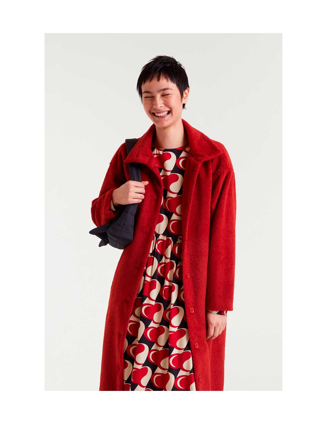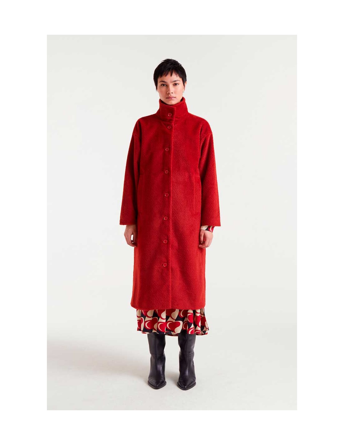 Μακρύ παλτό με κόκκινο ύφασμα με κοντό πέλος. Γιακάς με πέτο και μακριά μανίκια. Κλείσιμο με κουμπιά μπροστά. Ελαφρώς χαμηλωμένοι ώμοι. Μπροστινές τσέπες. Φόδρα. Το μοντέλο έχει ύψος 177 εκ. και φοράει μέγεθος S.
