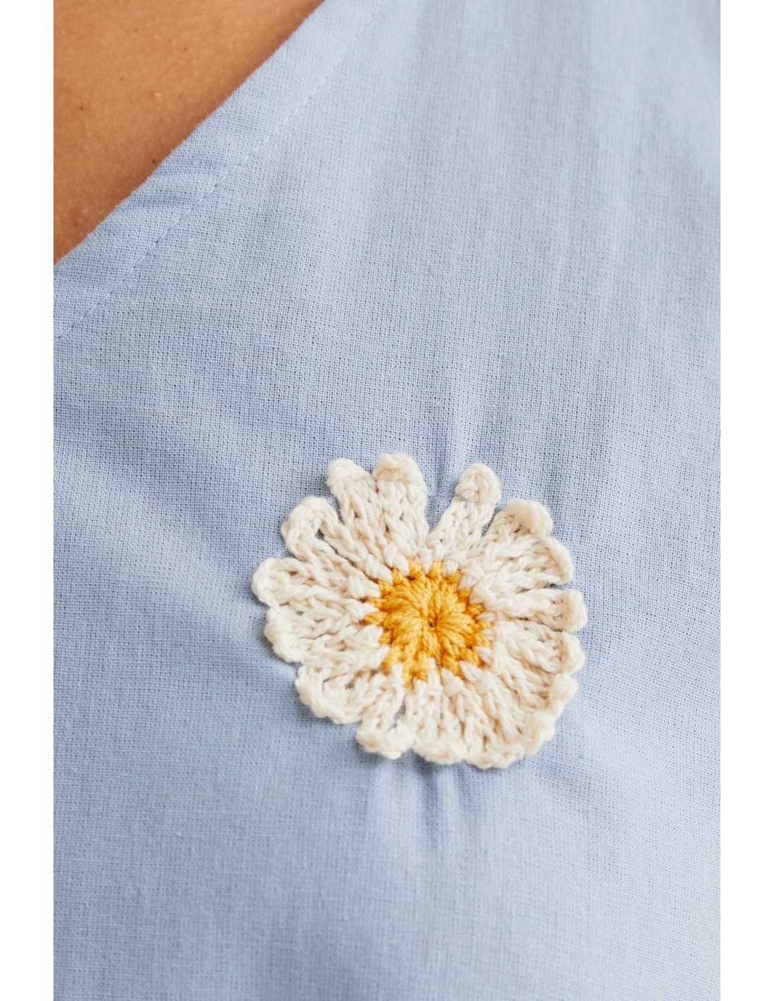 Κοντό φόρεμα από 100% βαμβάκι, ανοιχτό μπλε με κέντημα μαργαρίτας. Με V ντεκολτέ και αμάνικο. Το μοντέλο έχει ύψος 173 εκ. και φοράει μέγεθος S.